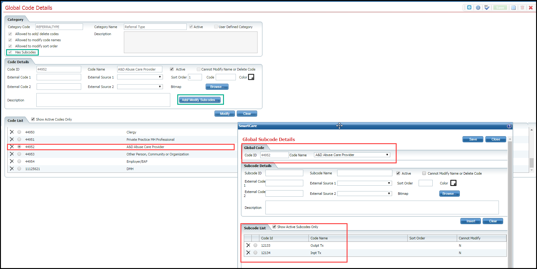 The global code 44952 A&D Abuse Care Provider has the Has Subcodes checkbox selected (note the upper left green box in the figure below). This check box being selected activates the Add/Modify Subcodes button in the Code Details section of the page (note the second right side green box in the figure below.