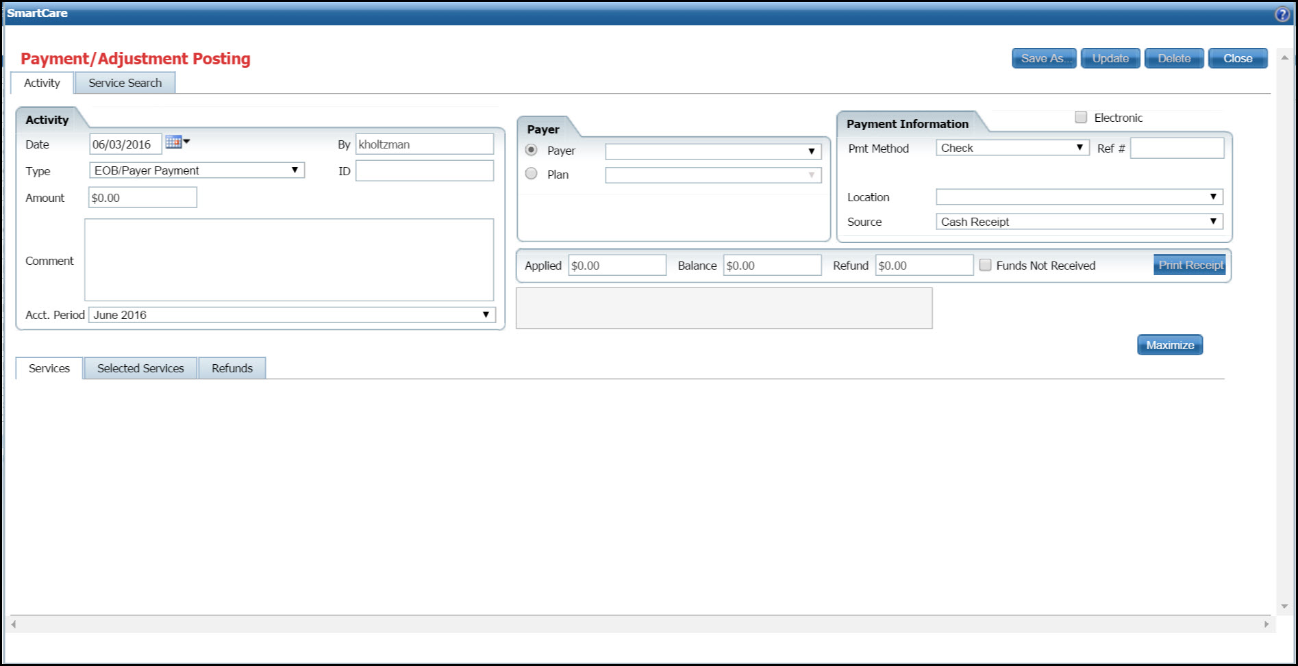 Complete the Payer section of the Activity tab.