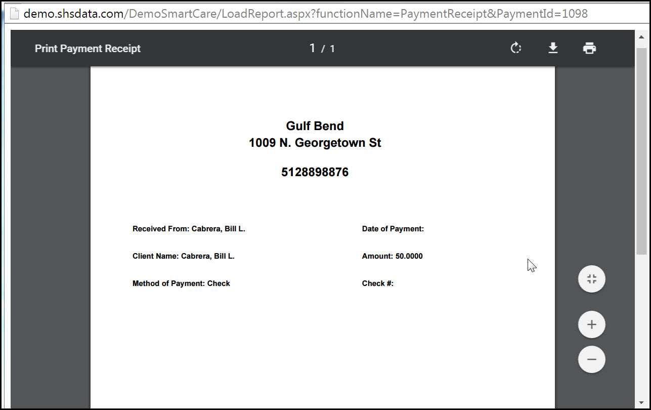 The payment is entered on the client's account. The Print Receipt button is activated.