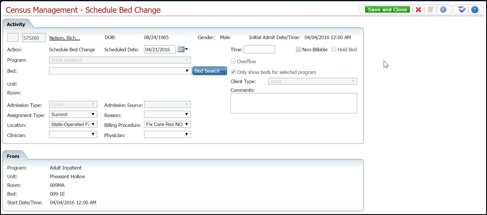 You can schedule a bed change for a client to occur on a future date. You can schedule a bed change for a client who is already admitted to a bed. A scheduled bed change means you are setting a date and time in the future when the client will be moved to the different bed. You can: