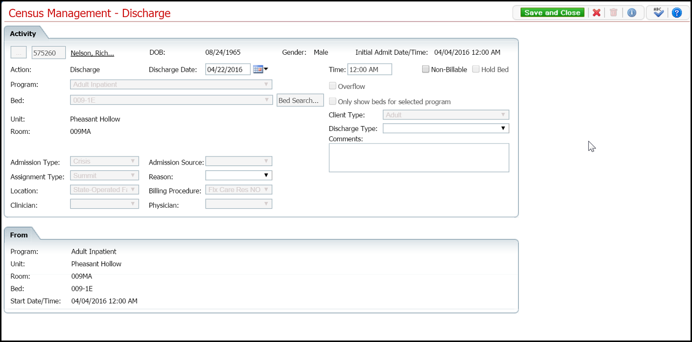 Complete the required and necessary fields on the Census Management - Discharge page. You can change any of the fields that are listed at the beginning of this task.