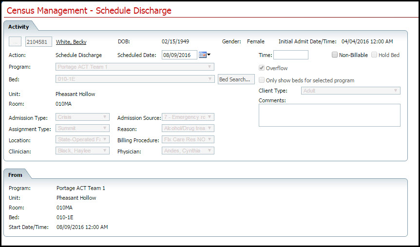You can schedule a discharge for a client who is admitted to a bed. Scheduling a discharge lets you set a date and time in the future. When that date and time arrive, the activity on the client's account is changed to a discharge procedure.