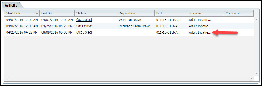 Find the entry in the Activity section that represents the Scheduled Discharge. Look for a record with an End Date and Time in the future. Notice the red arrow in the figure above pointing to a scheduled discharge entry.