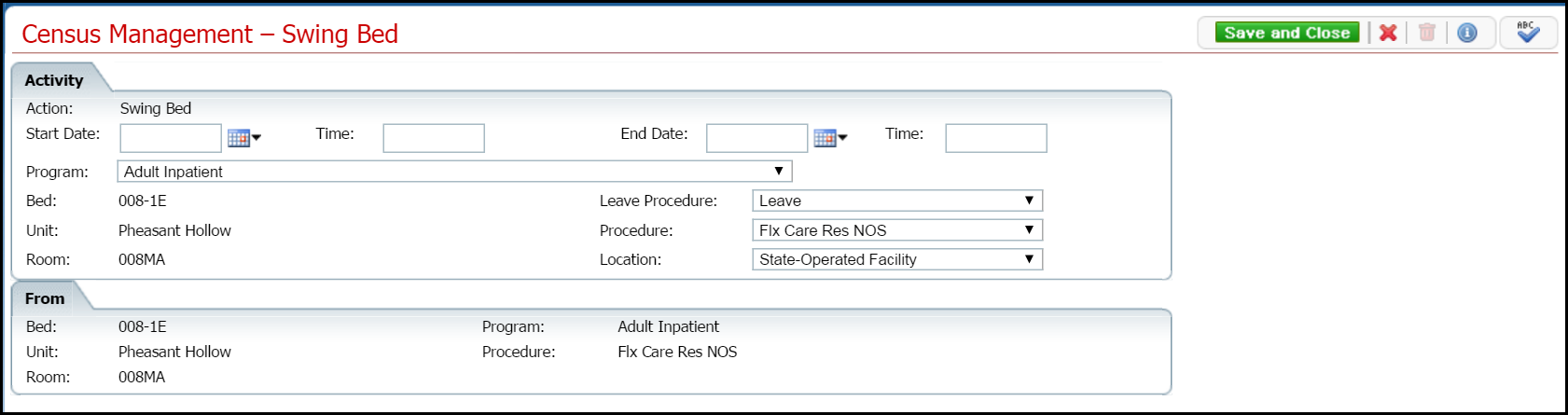 The Swing Bed option gives you the ability to change bed details for an open bed from the Bedboard list page. When you make changes using Swing Bed, the changes are updated on the Bedboard list page and also on the Units/Rooms/Bed list page in Administration.