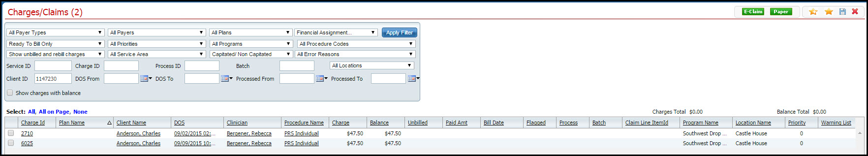 The Charges/Claims list page is displayed with the client's charges shown that are ready to bill.
