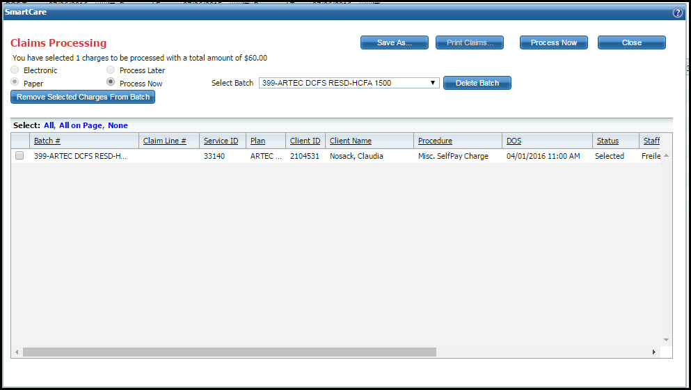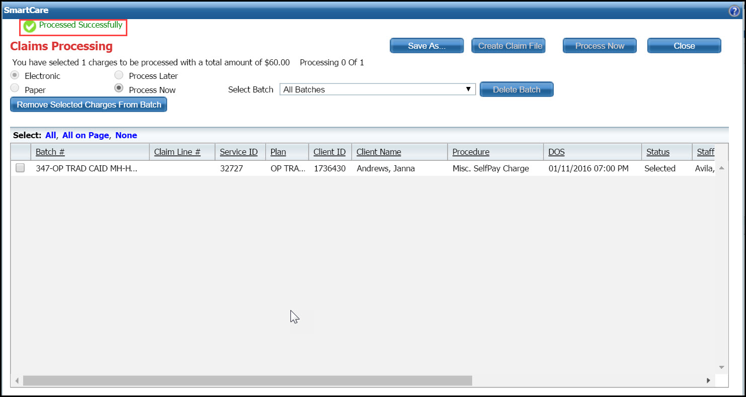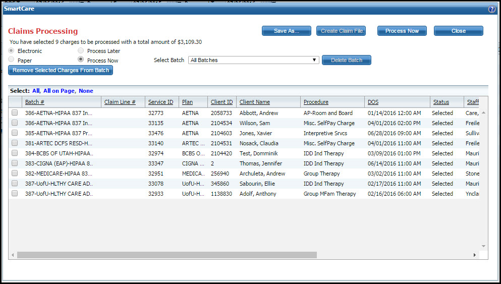 All claims listed on the page are processed into claims, unless there is a problem with the charge line, in which case the charge line is excluded from the claim.