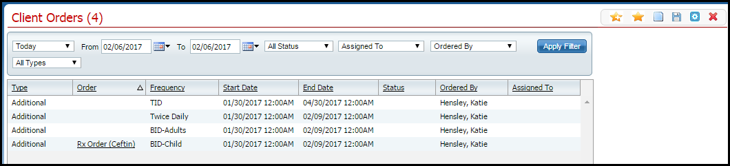 An order is the prescription from a physician regarding treatment of a client. An order can include medication, laboratory work or other procedures that need to be completed for the client. These orders are generally applied to Inpatient and Residential clients.