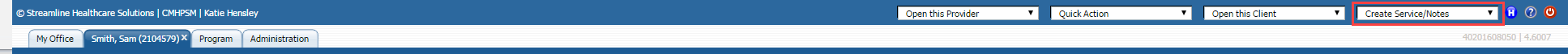 From the SmartCare title bar, click on the down arrow in the Create Service/Notes drop down. Refer to the red box in the figure above for the location of the down arrow. The list is displayed. See figure below.