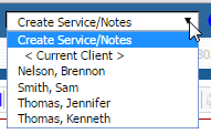 You can quickly display the Service Note page for a specific client using the drop down list on the title bar. Refer to the red box in the figure below. The figure illustrates the SmartCare title bar.