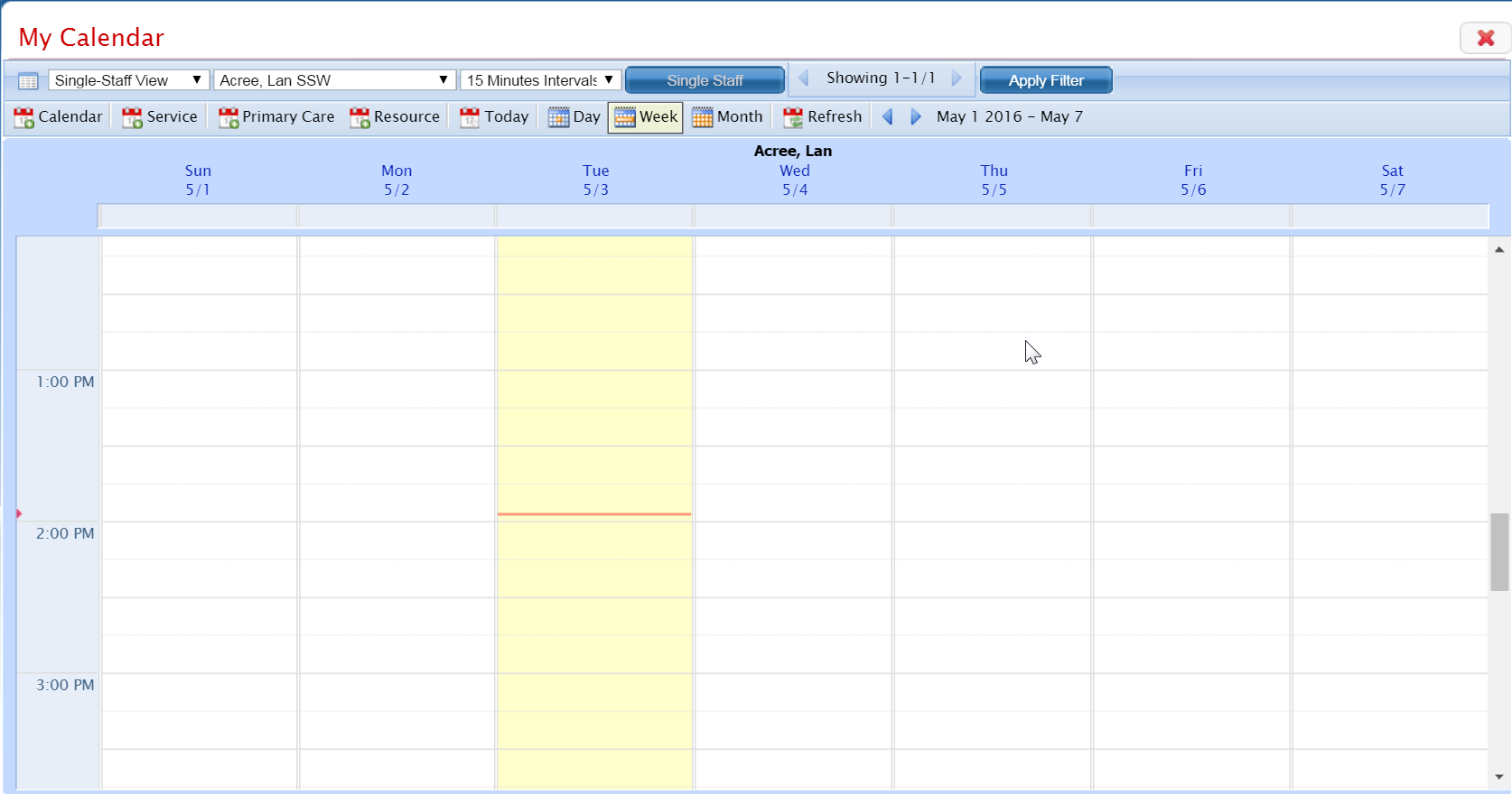The My Calendar page is displayed. The calendar for the staff member who was assigned to the service where you clicked on the a Schedule Follow-Up icon is displayed. View field definitions.